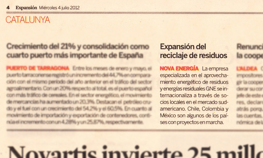 | | Publicado 04/07/2012 11:08 |  | NOVA ENERGÍA - La empresa especializada en el aprovechamiento energético de residuos y energías residuales GNE se internazionaliza a través de socios locales en el mercado sudamericano. Chile, Colombia y México son algunos de los países con proyectos en marca. | Leer más >>